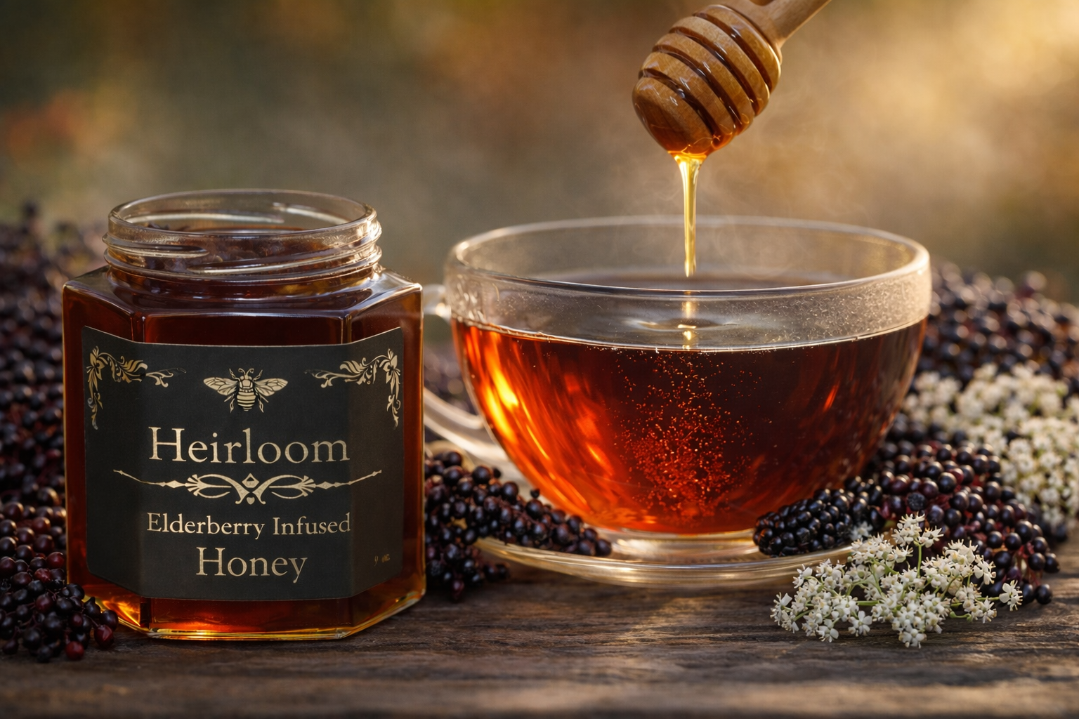 A delicious raw sweet honey infused with Elderberry creating a powerhouse of antioxidants in a jar. By naturally infusing our honey in the sun we avoid using a heating process that destroys all the natural benefits of honey thus our honey maintains the Elderberry antioxidants and vitamins that may boost your immune system, tame inflammation and prevent and ease cold and flu symptoms. The combination of raw honey, elderberry & cinnamon gives a balanced flavor that's a smooth palatable taste.